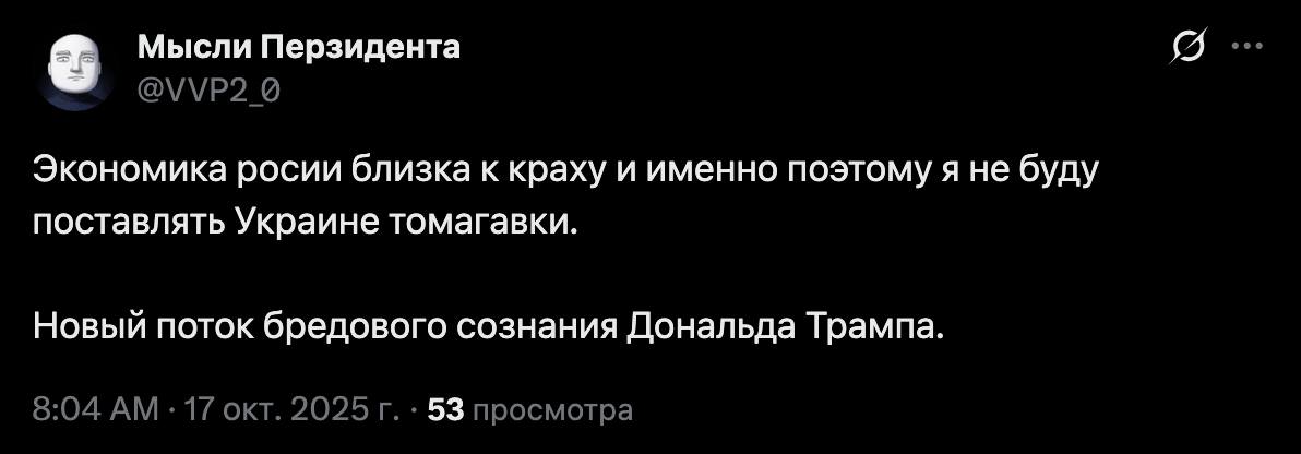 1. Общественное мнение в рф к Трампу меняется как погода в мае. Во время встречи на Аляске прям видеоклипы снимали, мол, танцуем. Под музыку трогательную. Как пошли разговоры про передачу оружия Украине - прокляли всё, включая музыку. После этого сообщения опять нахваливать начнут.