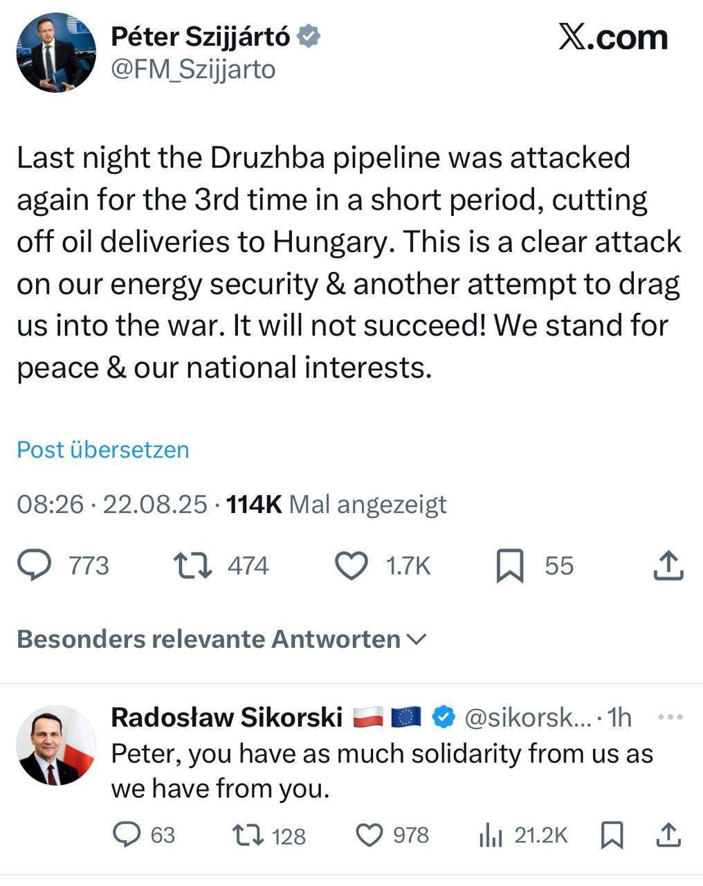 Тем временем, пишут, что "Венгрия и Словакия обратились в Еврокомиссию - с просьбой гарантировать безопасность поставок по нефтепроводу «Дружба» после атак ВСУ".