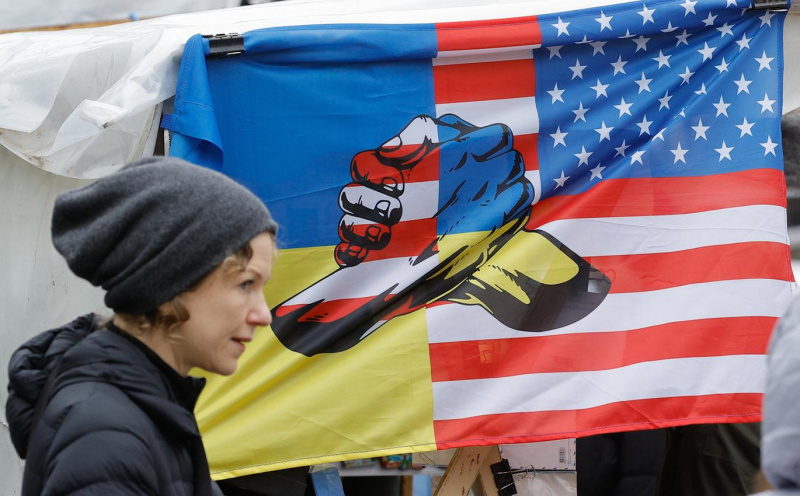 Флаг в Киеве, символизирующий украино-американскую дружбу (SCANPIX / EPA)