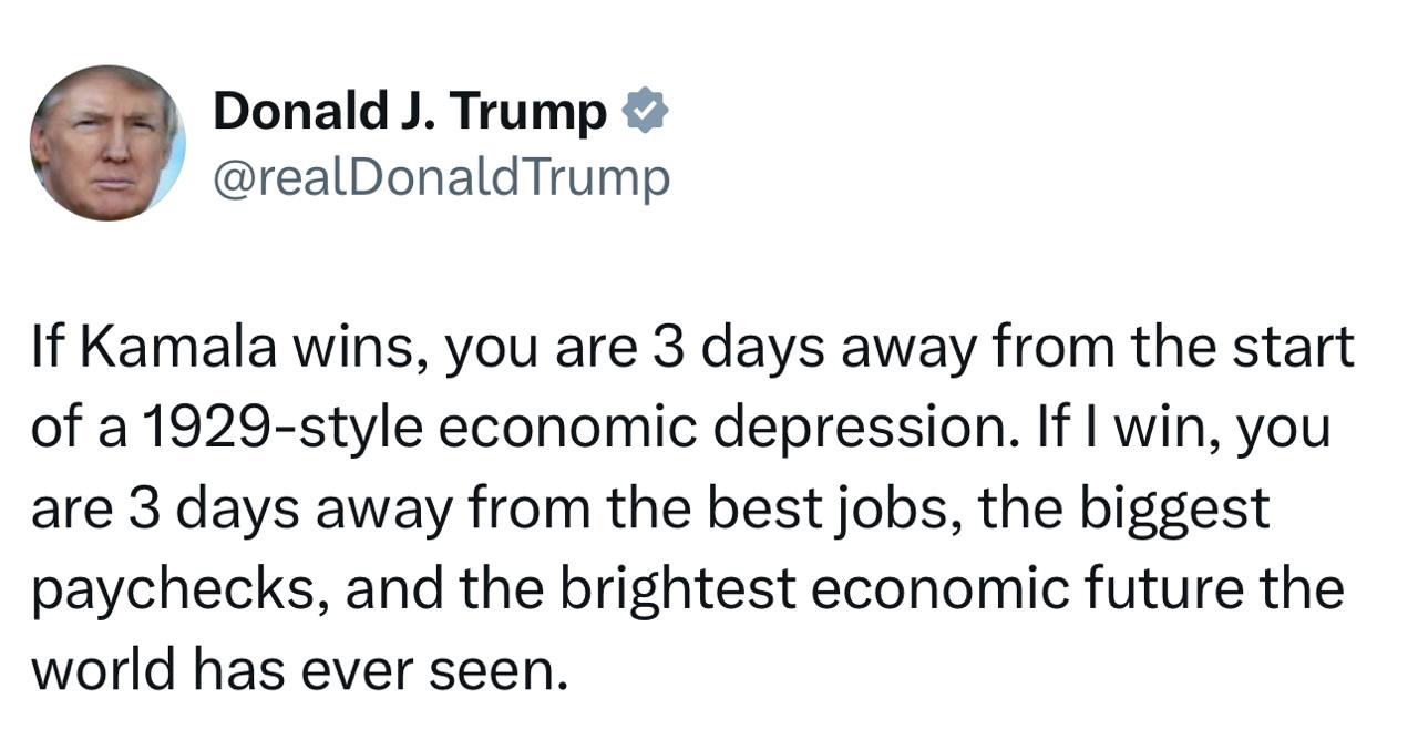 Дональд Трамп 03.11.2024: Если победит Камала, вас отделяет всего три дня от начала экономической депрессии, подобной той, что была в 1929 году. Если же победу одержу я, через три дня вас ждут лучшие рабочие места, самые высокие зарплаты и самое блестящее экономическое будущее, которое мир когда-либо видел.