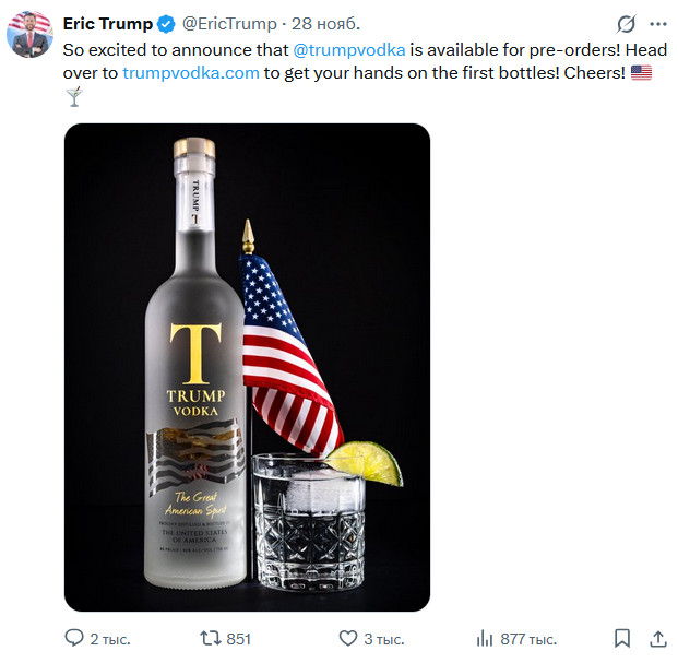 Эрик Трамп, второй сын 45-го и 47-го Президента США Дональда Трампа и Иваны Трамп, счастлив сообщить недорогим американцам, что открыт предзаказ на трамповку - водку Trump! Это элегантный и хорошо пьянящий напиток, созданный для высокой производительности, с гордостью разработанный и изготовленный в США из натуральных американских продуктов, произведенных исключительно в Америке. Боже, храни Америку! Да здравствует ПРЕЗИДЕНТ СОЕДИНЕННЫХ ШТАТОВ АМЕРИКИ ДОНАЛЬД ДЖ. ТРАМП!