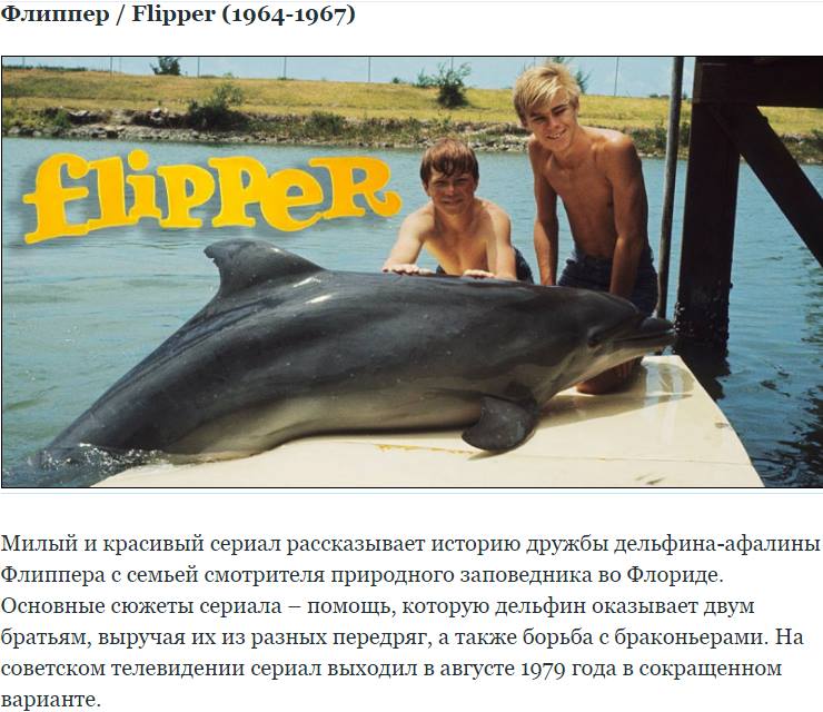 Флиппер - это дельфин из сериалов 1964-1967 и 1995-2000. Первый по советскому ТВ показывали.