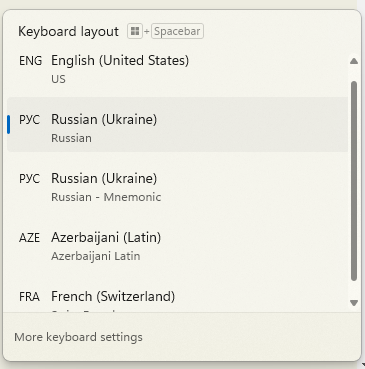 на самом ноутбуке нет кириллицы (только внешняя), поэтому я еще добавляю еще и Mnemonic (Транслит) для работы без клавы. Всякие французские à, è, ù, ç тоже через правый Alt + CharCode ввожу.