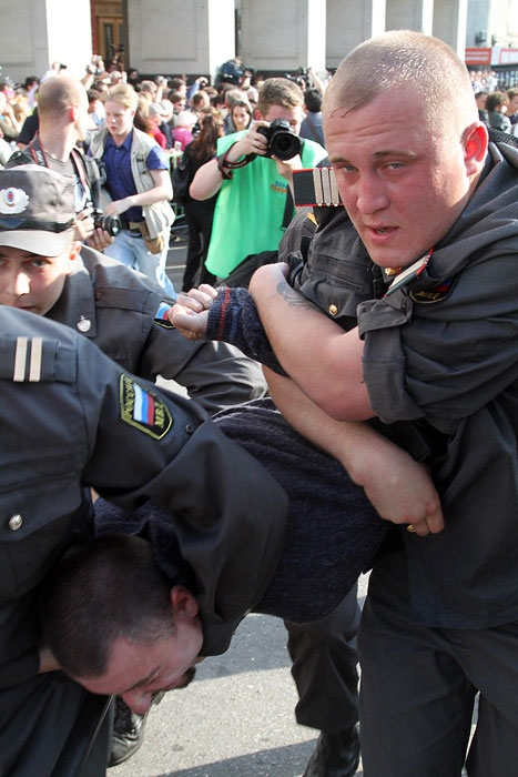 В продолжение беседы Вовы с Юрой о "Маршах несогласных". Сегодня несогласные обнаглели настолько, что перекрыли как минимум двадцать больниц, располагающихся на Триумфальной площади. Также они, разумеется, помешали примерно 14 миллионам москвичам отправиться в понедельник на дачи. Неудивительно, что в этот раз наш родной до боли в почках ОМОН был суров, справедлив и арестовал и измудохал порядка сотни этих выродков - простых российских граждан.