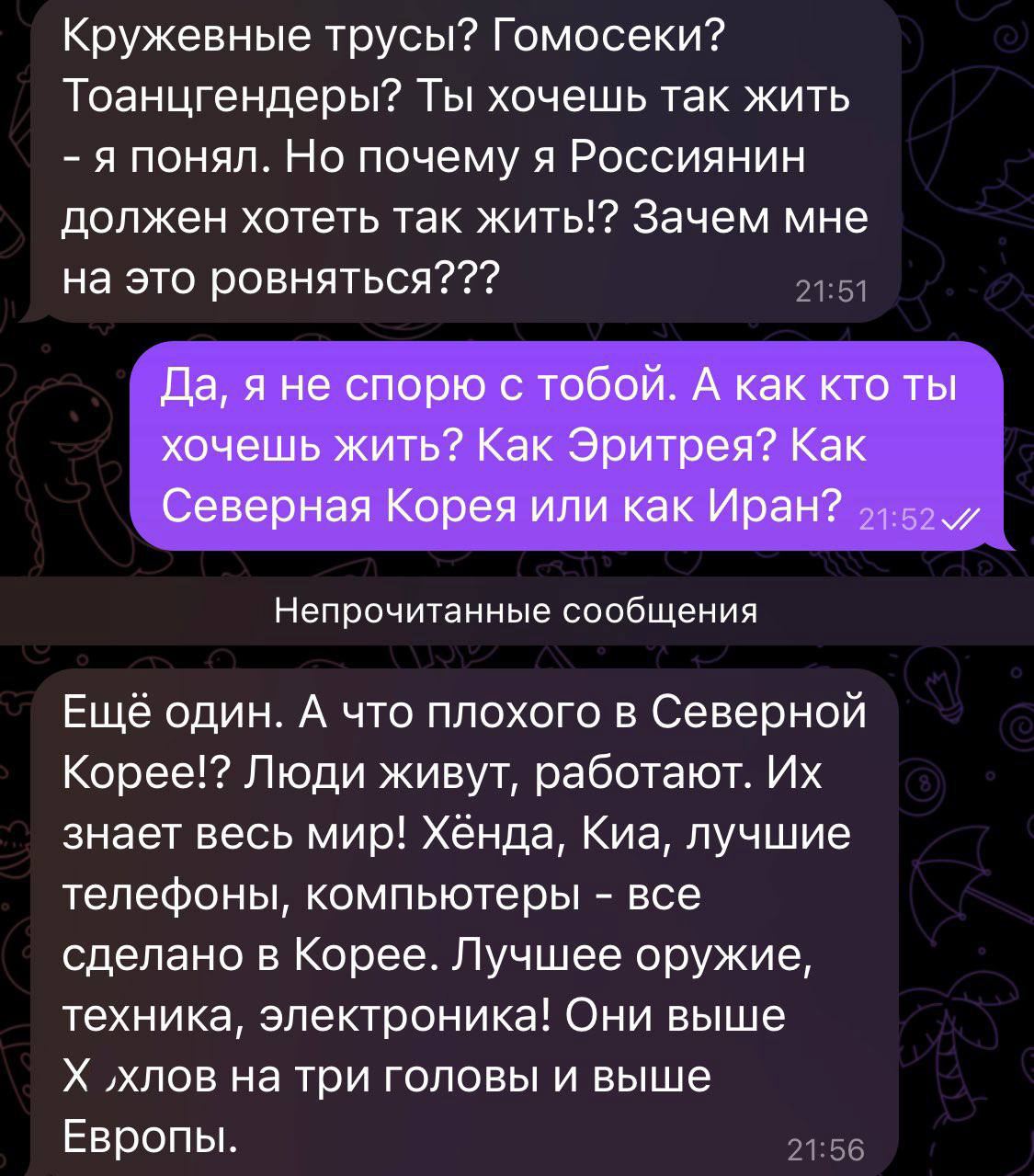 Типа есть Северная Корея, Иран, Беларусь и Россия, которые хотят что-то там строить, со своими ценностями, и защищают свое мировоззрение.- В принципе, это можно даже понять (не принять, а понять логику действий). Если конечно, не считать того, что все эти страны пытаются это делать при помощи ядерного оружия. И именно поэтому они оказались в изгоях и под санкциями. Сходу можно назвать другие государства, которые делают тоже самое но без ядерного оружия: Турция, Саудовская Аравия, Япония, Индонезия и многие другие (даже Афганистан).- Причем, не во всех из них есть демократия, а того самого ЛГБТ в некоторых из них и вообще нет.