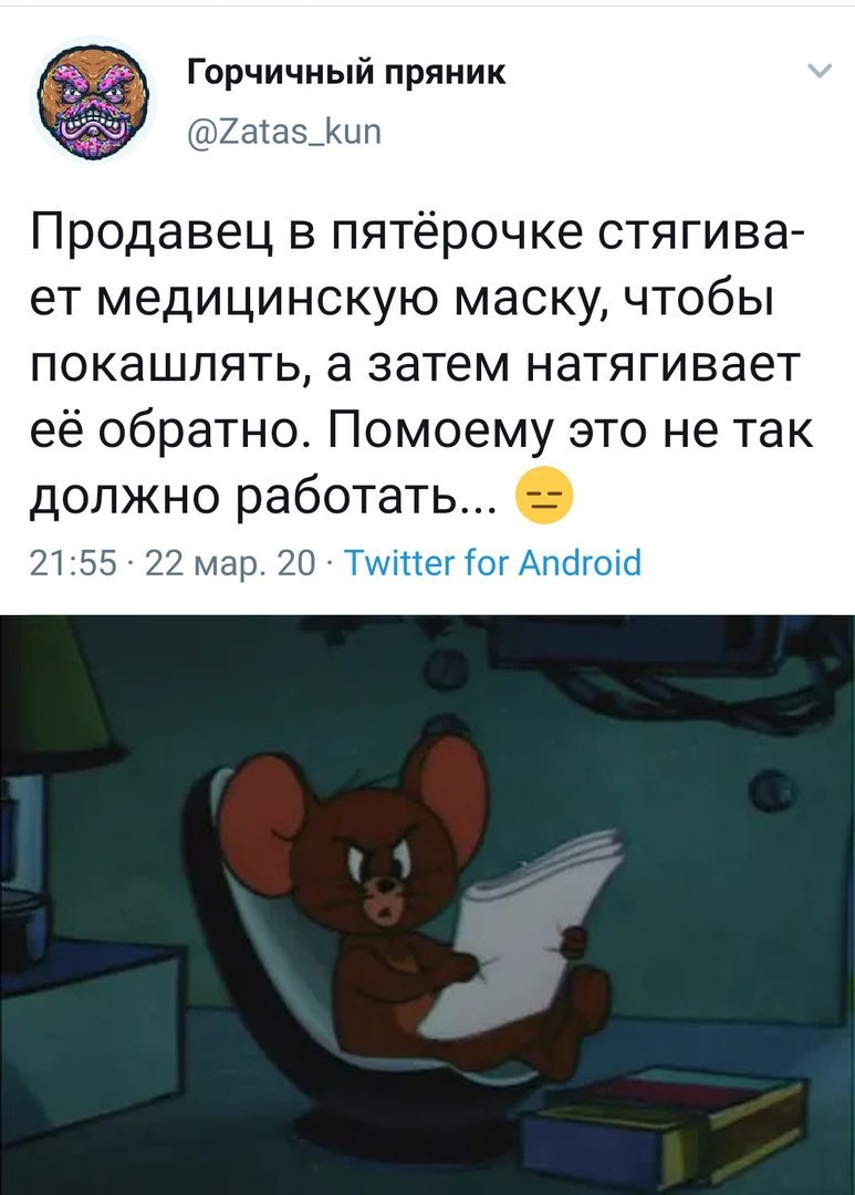 Так интересно наблюдать, как люди приходят в масках в магазин, ходят в этой маске, ходят, а потом подходят к стойке с пакетиками и трогательно снимают маску, чтобы послюнявить пальчик и пальчиками растилибомкать пакетик, дабы он раскрылся. А потом снова послюнявить пальчик, который черт знает чего касался в магазине, и снова растилибомкать другой пакетик.