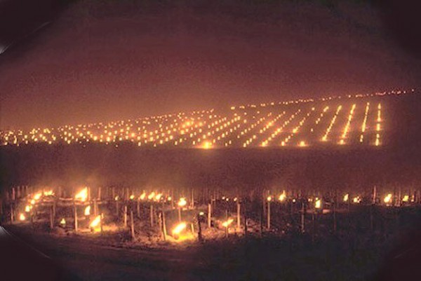 Во Франции в Шабли виноделам приходится по ночам разводить на виноградниках костры, чтобы спасти урожай от ночных заморозков. (Фото отсюда.)