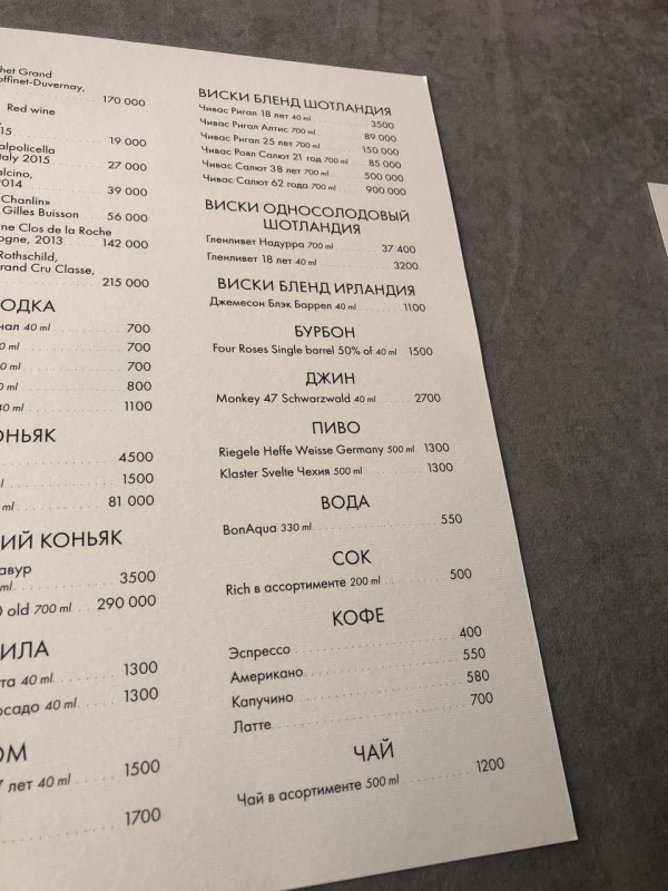 40 граммов 18-летнего Чиваса - 3500 рублей. Его стоимость в обычном магазине - 6169 рублей за 700 граммов. В одной бутылке - 17,5 порций. Умножаем 17,5 на 3500 - 61250 рублей. Практически ровно в десять (!) раз. И так практически по всему дорогому алкоголю.