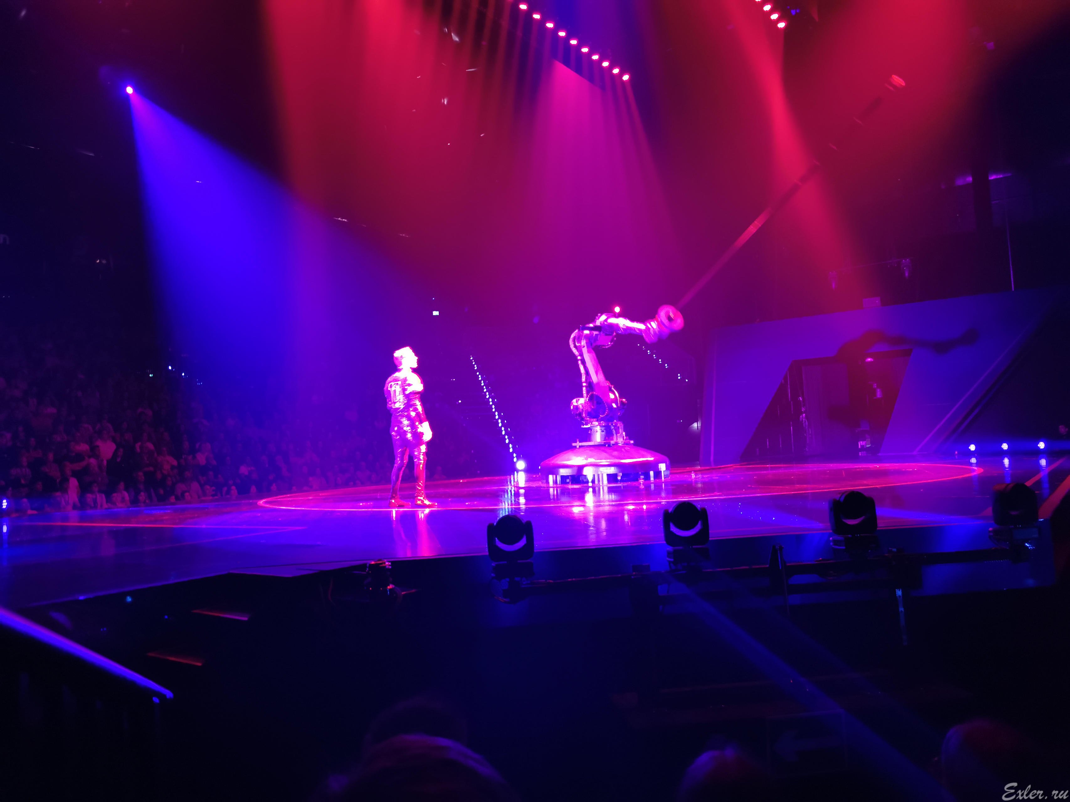 Классно придуманный номер с роботом, который крутит туда-сюда длинный шест: на шесте артист демонстрирует всякую акробатику.