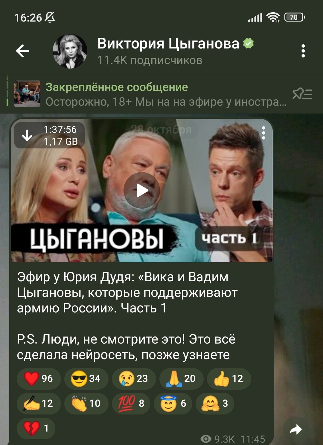 P.S.: Позднее Цыганова в своем телеграм-канале написала, что в интервью не она с мужем, это всё нейросеть и технологии deepfake.