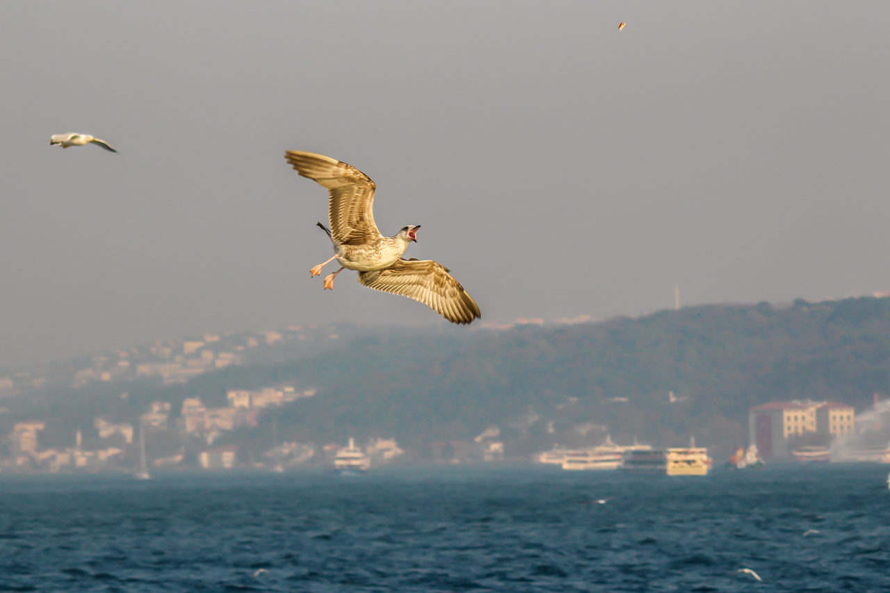 Ну и заснял, как чайка ловит кусок хлеба. Вы посмотрите, разве ж это чайка? Это птеродактиль какой-то!
