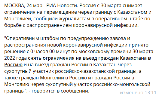 И это еще не все. Несколько часов назад Россия открыла сухопутную границу с Казахстаном.