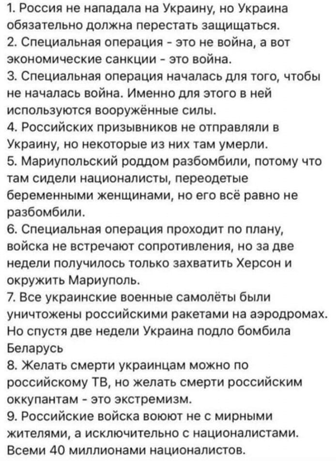 Мои в России реально мне рассказывают, что у меня мозги затуманены западной пропагандой, что города в Украине бомбят сами украинцы и всё подстроено Байденом, а Зеленский марионетка. Но при этом в Украине нацисты. А Крым забрали в 2014 потому что он испокон веков был Российский и в Украине были беспорядки. Какая тут связь ХЗ, но я бросил затею спорить на эту тему... когда холодильник победит телевизор, крысу выкинут из кремля и откроют архивы тогда и поговорим. Да даже и то не уверенности что поверят...