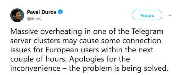 Позднее в Telegram сообщили, что причиной неполадок в работе сервиса стали веерные отключения электричества в Нидерландах.