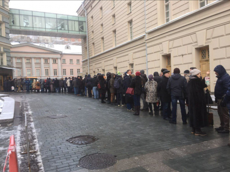Угадайте, почему перед "Большим" выстроилась такая здоровенная очередь из сотрудников и артистов? (Фото отсюда.)