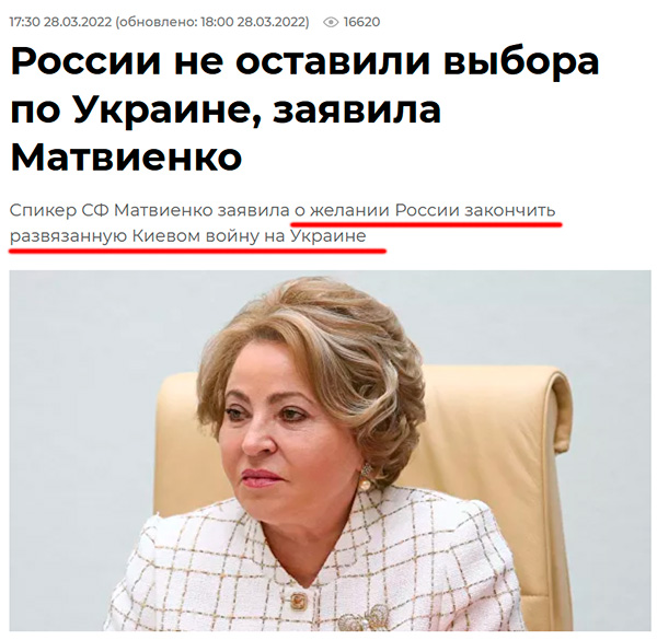 По мнению Матвиенко, войну на (в) Украине, то есть на (в) Донбассе, развязал Киев, а Россия провела спецоперацию, чтобы ту войну закончить.