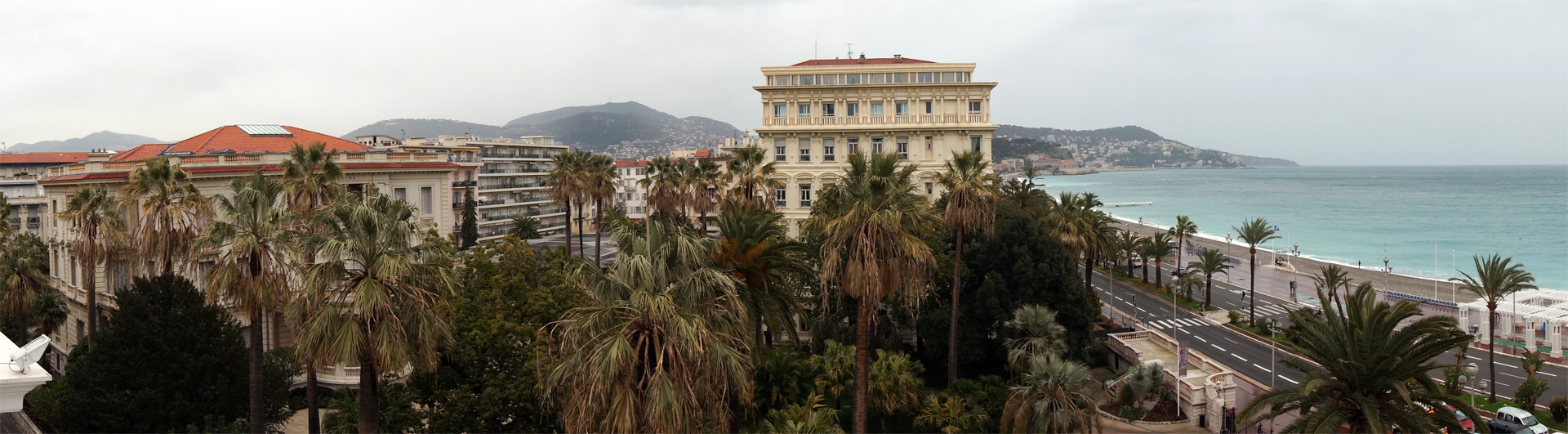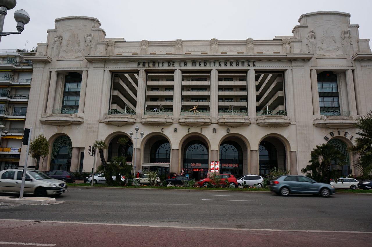 Пасмурно, срывается дождь. Вышли промяться по Променаду - тоже пасмурно, тоже срывается дождь. Вот соседний отель Palais de la Mediterranee. Тоже пасмурно, тоже срывается дождь.