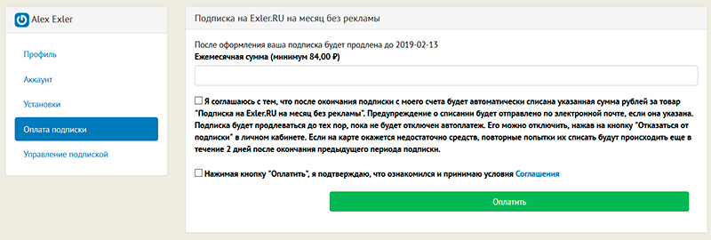Важный момент: подписку можно оплатить только пластиковой картой. (Ну, точнее, оплатить-то можно чем угодно из того, что предлагает Robokassa, но это будет разовый перевод, а не подписка. Подписка - оплата картой.)