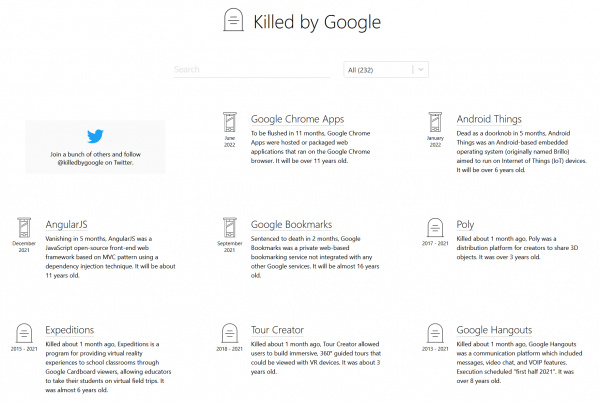 Любопытная страничка, на которой собирают все сервисы, убитые (закрытые) Гуглом, и этих сервисов, как выяснилось, аж 232.