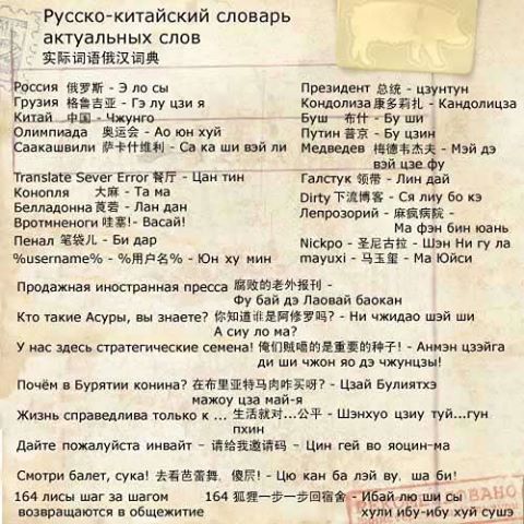 хаха))) жаль не нашел этот словарик перед поездкой... пришлось английским перебиться. а вообще главный минус в китае - постоянно растущий список заблоченных сайтов. всем, кто собирается - обязательно заранее настройте впн на ноуте и мобильном