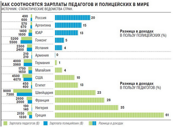 В "Коммерсанте" по этому поводу сделали интересную табличку, в которой сравнили зарплаты учителей и полицейских в разных странах. Познавательно. Причем там кроме процентной разницы в доходах еще очень интересно сравнить сами цифры зарплат. Российские зарплаты где-то на уровне египетских. Ниже - только в Нигерии и Армении.