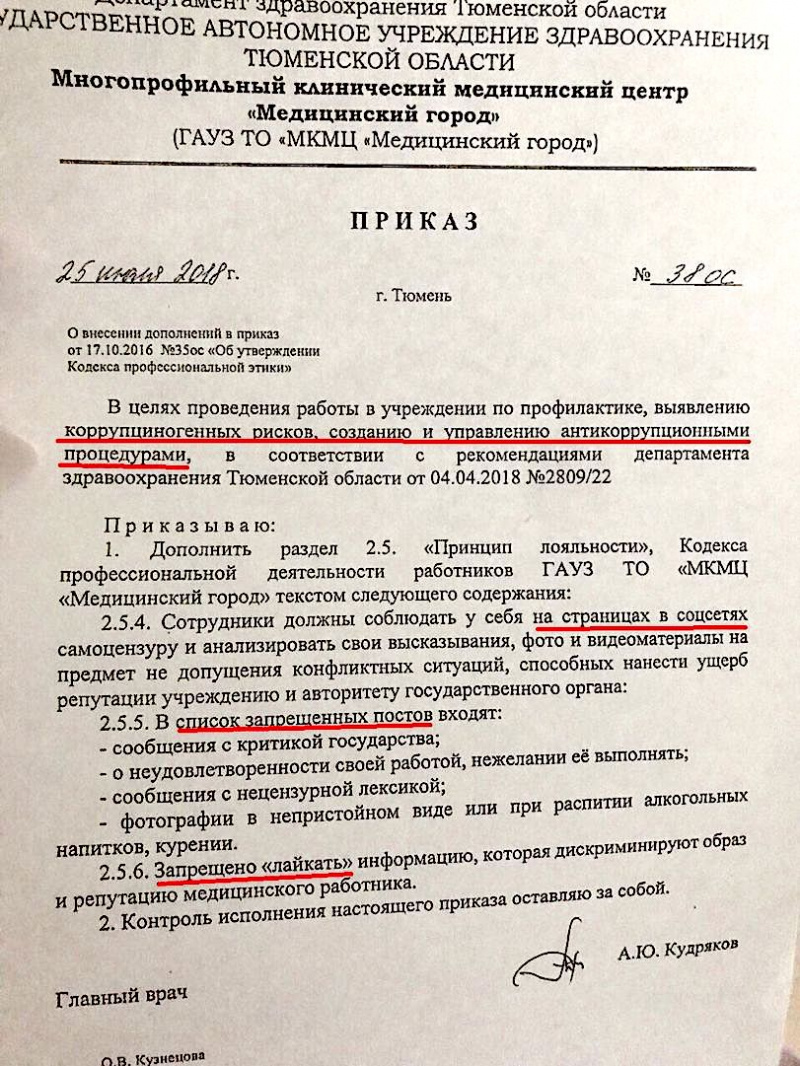 Главный врач ГАУЗ ТО МКМЦ «Медицинский город» - Андрей Юрьевич Кудряков отменил, вышедший на днях и вызвавший широкий отклик в социальных сетях, приказ о дополнении Кодекса профессиональной деятельности работников ГАУЗ ТО МКМЦ «Медицинский город».