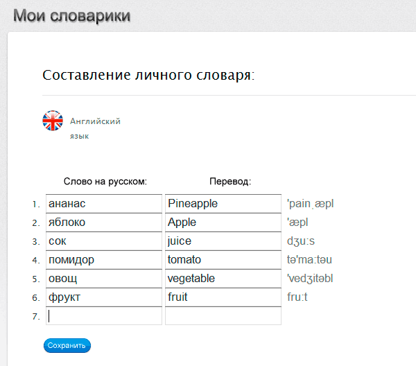 Подключились - после этого начинаете составлять свой словарик и учить по нему слова, причем при вводе слова, например, на русском, его перевод и транскрипция будут вводиться автоматически. Так что вам нужно будет подобрать только те слова на русском (или любом другом), которые вы хотите использовать в соответствующем иностранном языке.