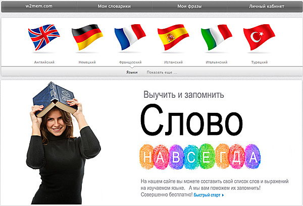 Следующий вопрос заключается в том, как именно создавать эту словарную базу и как ее заучивать? Так вот для этого как раз и существует проект под названием W2MEM.COM - Выучить иностранные слова навсегда!