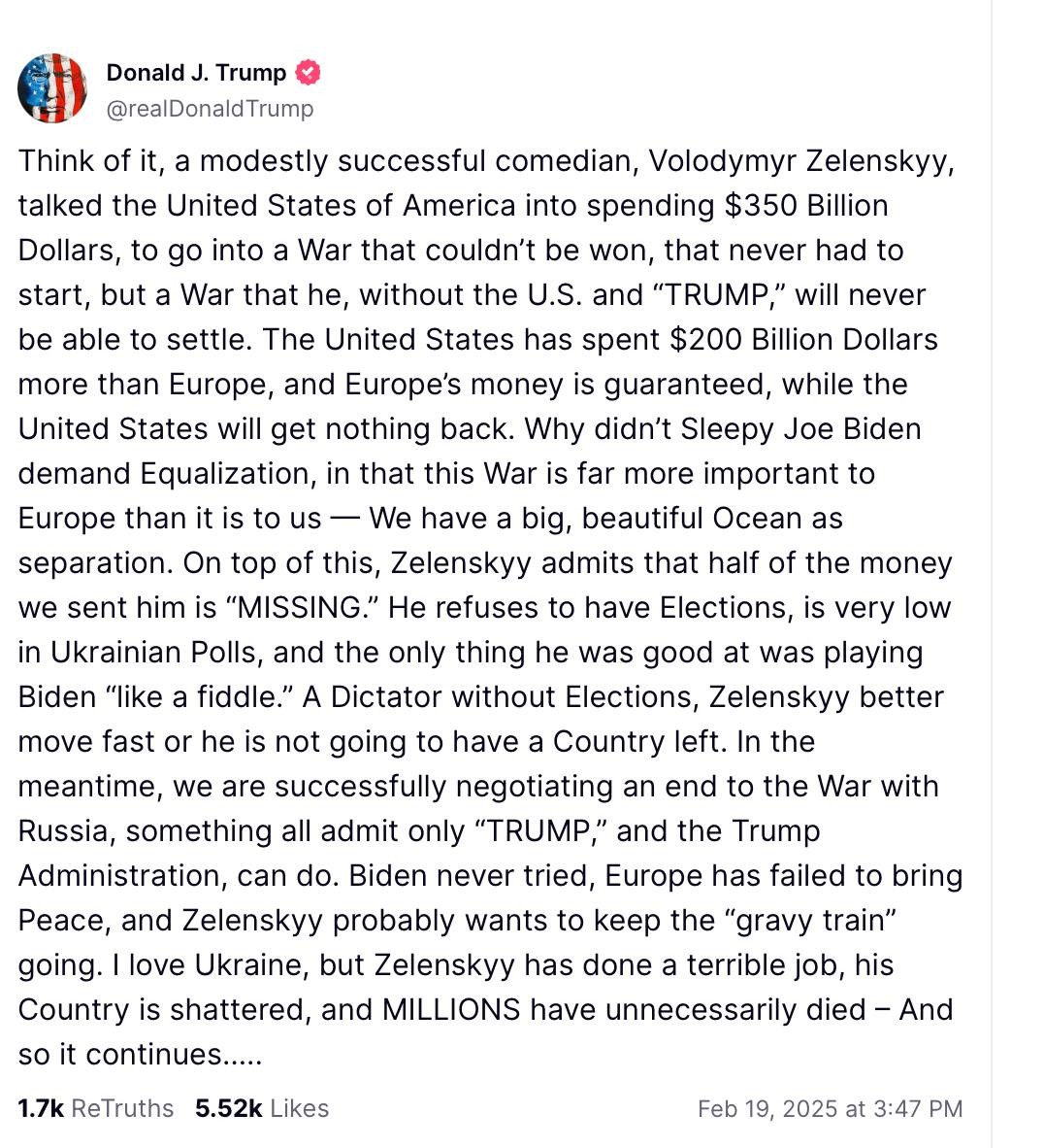 Think of it, a modestly successful comedian, Volodymyr Zelenskyy, talked the United States of America into spending $350 Billion Dollars, to go into a War that couldn’t be won, that never had to start, but a War that, without the U.S. and “TRUMP,” will never be able to settle. The United States has spent $200 Billion Dollars more than Europe, and Europe’s money is guaranteed, while the United States will get nothing back. Why didn’t Sleepy Joe Biden demand Equalization, in that this War is far more important to Europe than it is to us — We have a big, beautiful Ocean as separation. On top of this, Zelenskyy admits that half of the money we sent him is “MISSING.” He refuses to have Elections, is very low in Ukrainian Polls, and the only thing he was good at was playing Biden “like a fiddle.” A Dictator without Elections, Zelenskyy better move fast or he is not going to have a Country left. In the meantime, we are successfully negotiating an end to the War with Russia, something all admit only “TRUMP,” and the Trump Administration, can do. Biden never tried, Europe has failed to bring Peace, and Zelenskyy probably wants to keep the “gravy train” going. I love Ukraine, but Zelenskyy has done a terrible job, his Country is shattered, and MILLIONS have unnecessarily died — And so it continues.....