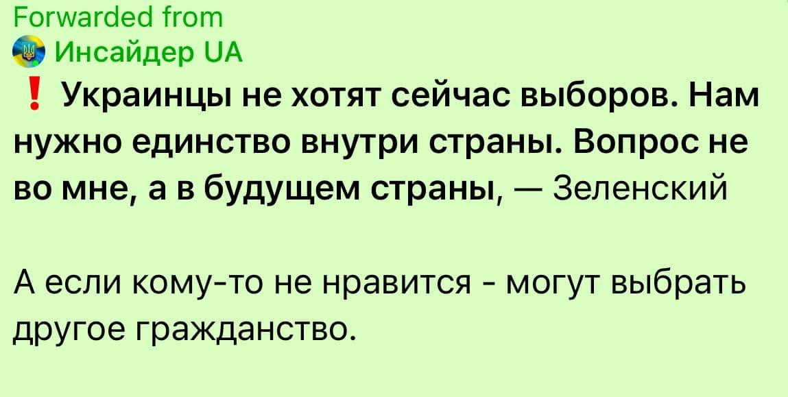 А войну начал Зеленский, да. Трамп ему говорил, что не надо было это все начинать, так чего Зеленский-то теперь жалуется? Трамп сам дошел до мысли о том, что в воюющей три года Украине давно не было выборов - сам дошел, своей кумпешкой. Не Путин ему в башку говна налил о том, что "Зеленский - нелегитимный", а сам Трамп дошел. Кстати, а те самые "4% поддержки Зеленского" Трамп этот бред из какой задницы вытащил? Из путинской, что ли? Или тоже сам допер, так что из своей собственной?