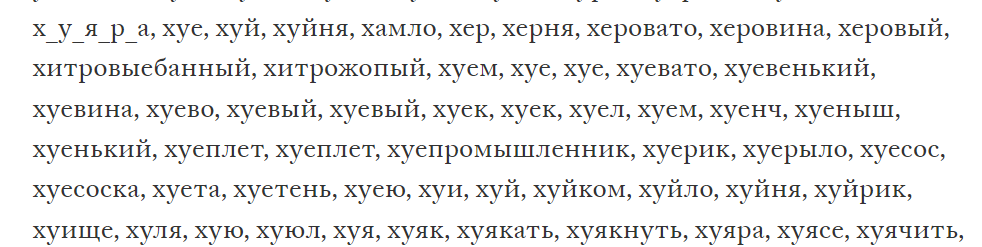 В документе слова и выражения отсортированы по группам: контекст педофилии, половых отношений, ну и непосредственно бранные слова (там столько всего интересного).