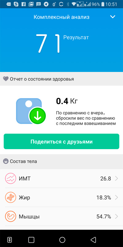 Загрузил приложение в смартфон, приложение весы само обнаружило, подключилось. Взвешивает быстро и меряет аж десять параметров. Нет, процент жира и мускулов, вес костей и раньше весы меряли. А тут типа как висцеральный жир еще измеряют, возраст тела (я думал, дадут тридцать пять, ан нет, определили почти точно), количество воды и протеинов в организме.