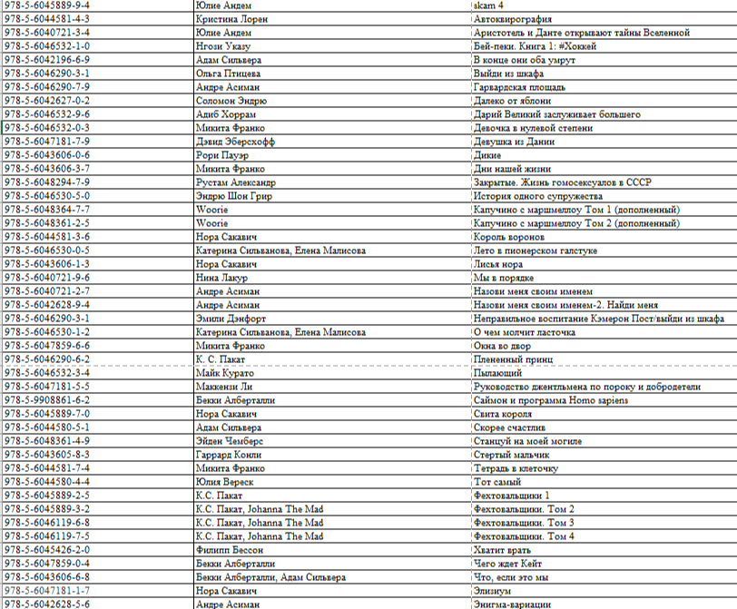 Среди книг есть «Лето в пионерском галстуке» и «Элизиум» от Popcorn Books, а также «Закрытые. Жизнь гомосексуалов в СССР» Рустама Александера (Individuum). Остальные экземпляры из списка также связаны с ЛГБТ* (например, первая и вторая части «Назови меня своим именем»). (Отсюда.)