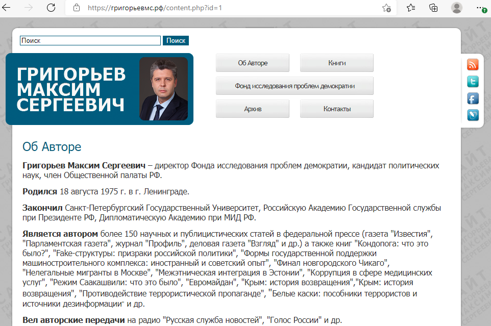 Гражданин Григорьев Максим Сергеевич на персональном сайте https://григорьевмс.рф разместил логотип социальной сети "Facebook" ("Фейсбук"), деятельность которой решением Тверского суда Москвы была признана экстремистской и запрещённой на территории России.