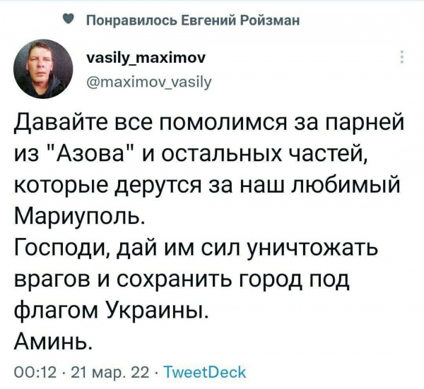 Всего наилучшего Ройзману и защитникам Украины. Верю, что Мариуполь выстоит против пузырящегося рашистского гноя.
