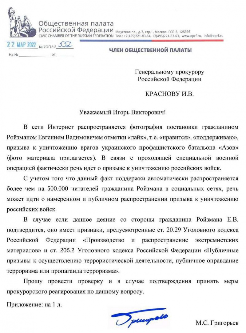 Некий Григорьев из российской общественной палатки это заметил и уже накатал донос в прокуратуру.