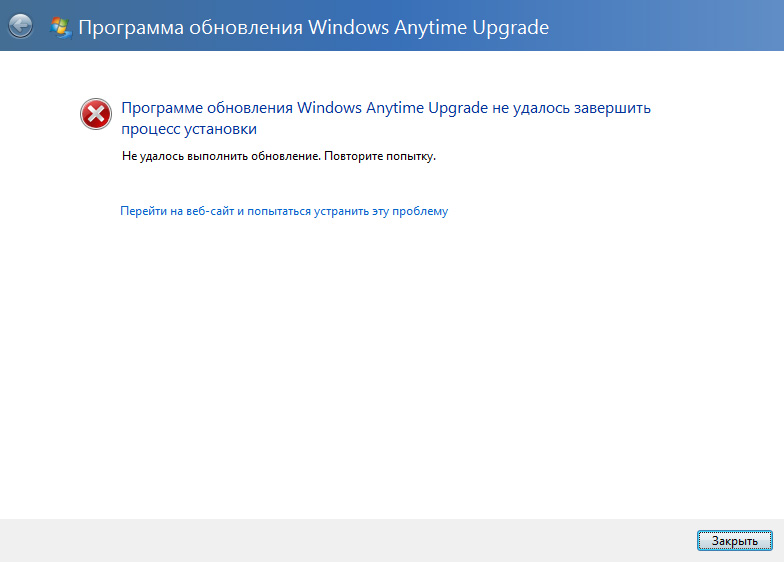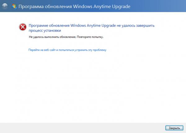 Запустил Anytime Upgrade, ввел ключ. Он программой признается, выводится лицензионное соглашение, запускается процесс апгрейда. Заканчивается процесс вот с такой ошибкой. При повторении - то же самое. Кто-нибудь сталкивался? Что с этим делать? Ключ апгрейда для русской версии, Windows Home Premium, разумеется, лицензионная и активированная (на ноутбуке).