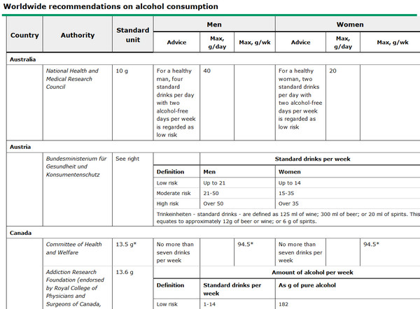 Про Австрию не совсем понятно. Низкий риск - до 21 дринка в неделю? А один дринк это 125 мл вина, или 12 грамм вина (или что одно и тоже?). Запутался.