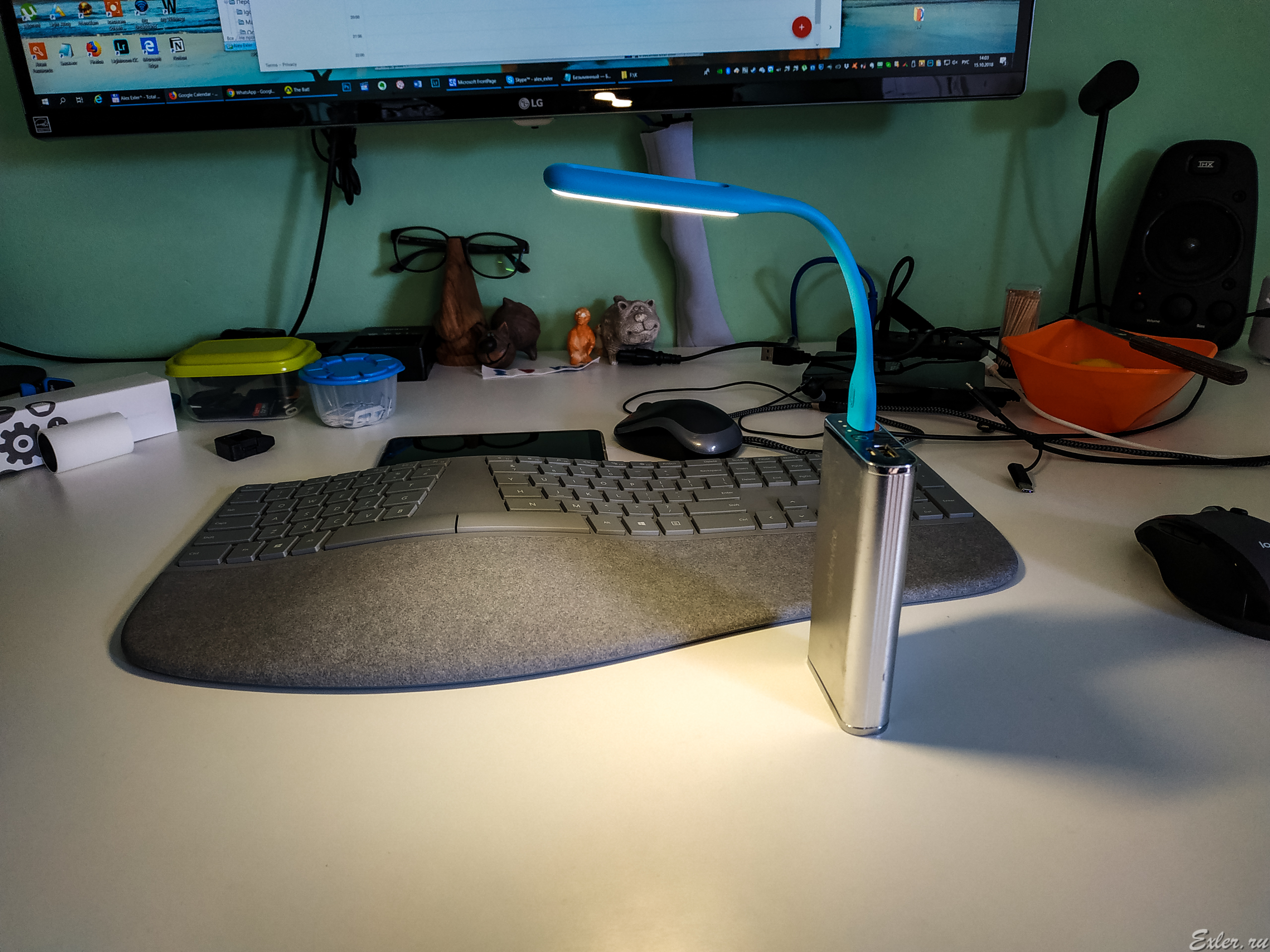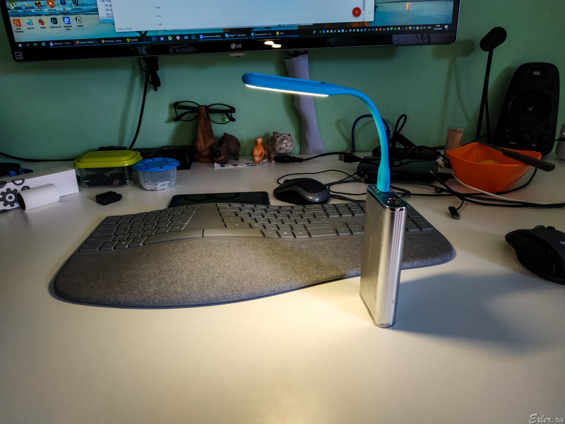 У многих мониторов сбоку есть USB-порт, как раз было бы удобно. А так как её крепить-то, чтобы она на стол светила, а не в лицо? (Если пауэрбанка нет.)