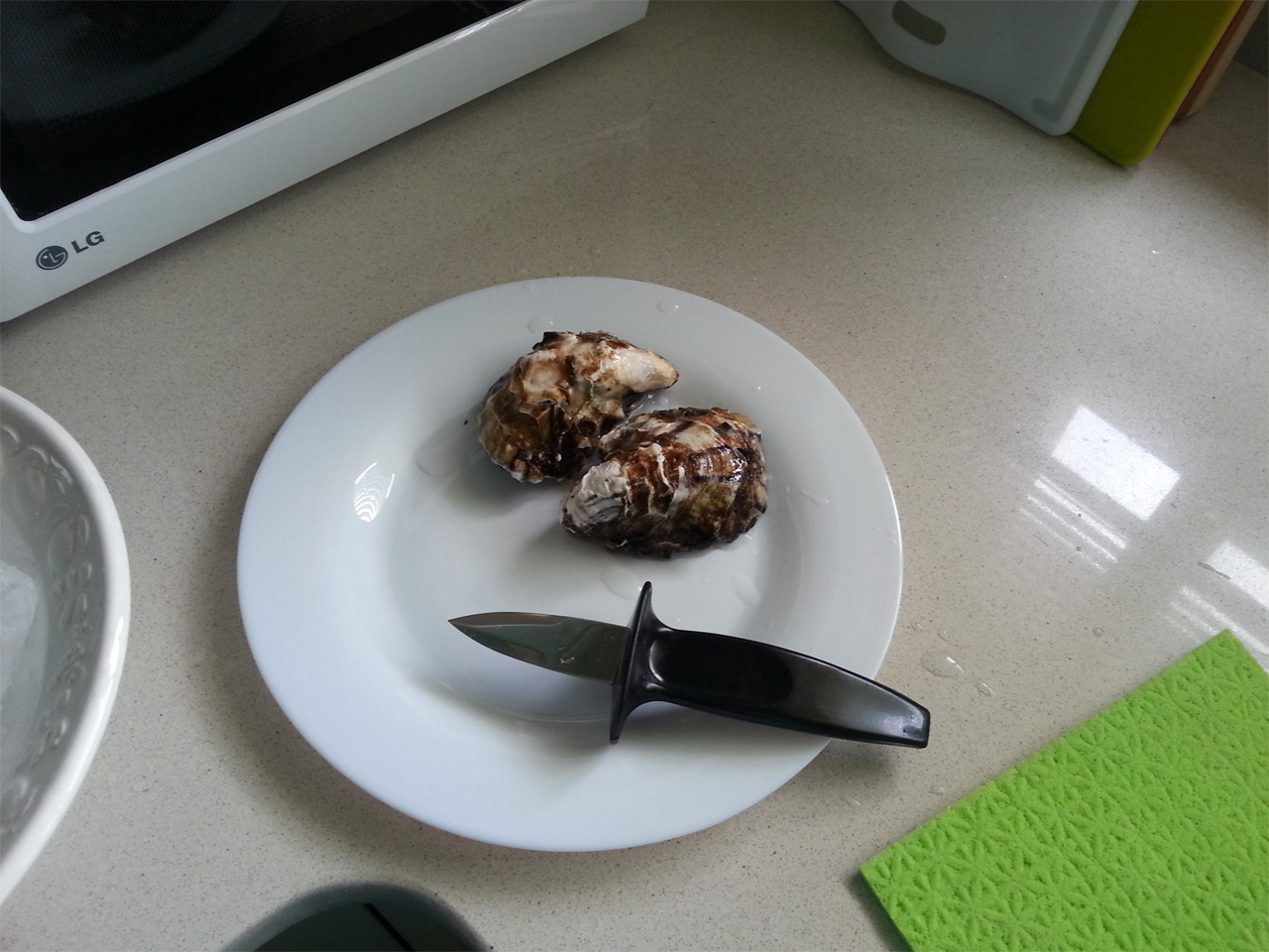 Привезли устриц домой, стали открывать. Перед этим, наслышавшись об ужасающих трудностях открывания устриц, объездили всю Калейю в поисках специального ножа для открывания устриц. Нашли один-единственный нож в одном-единственном магазине.