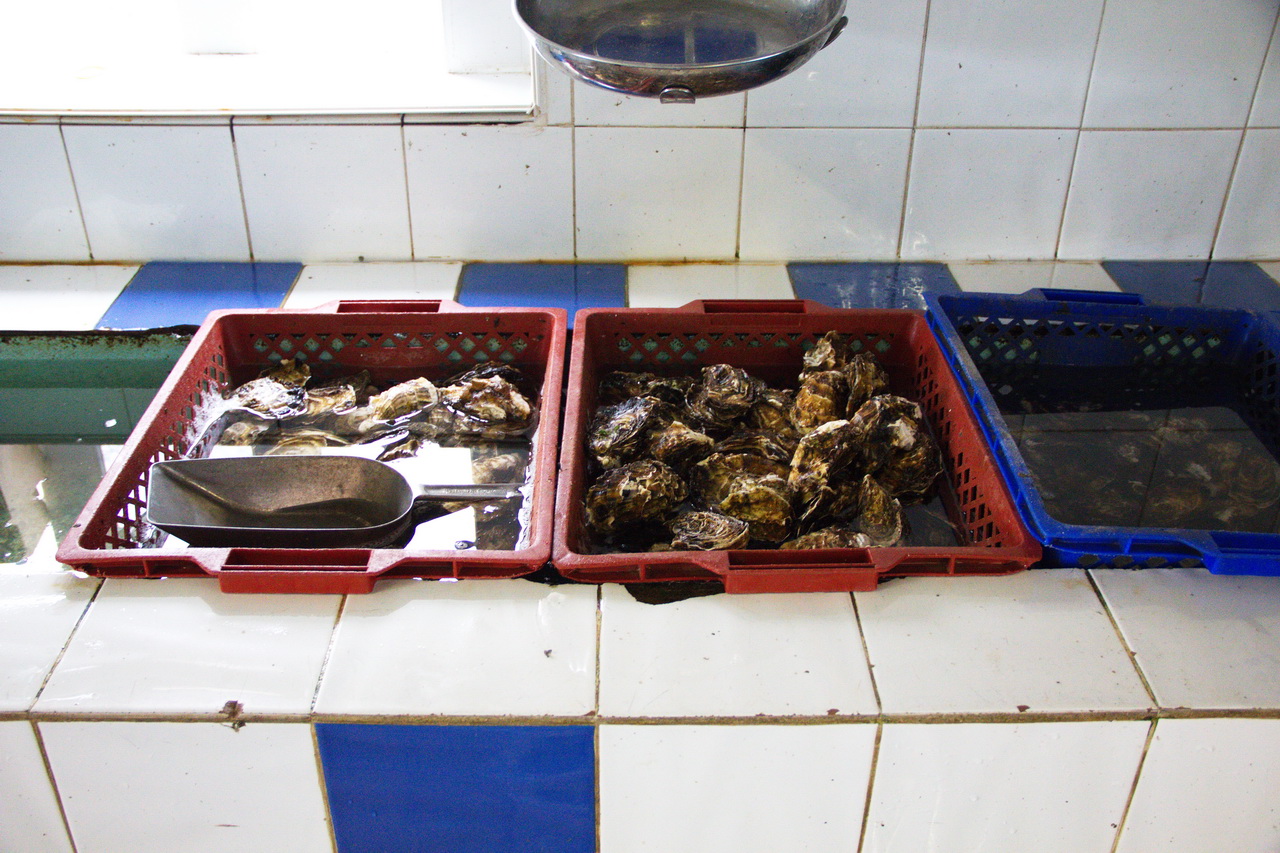 Обстановка внутри кафешек - совершенно спартанская: пластиковая мебель, здоровенные пластмассовые миски для раковин устриц. Работники кафешек ходят в резиновых сапогах - по полу часто бывает разлита вода.