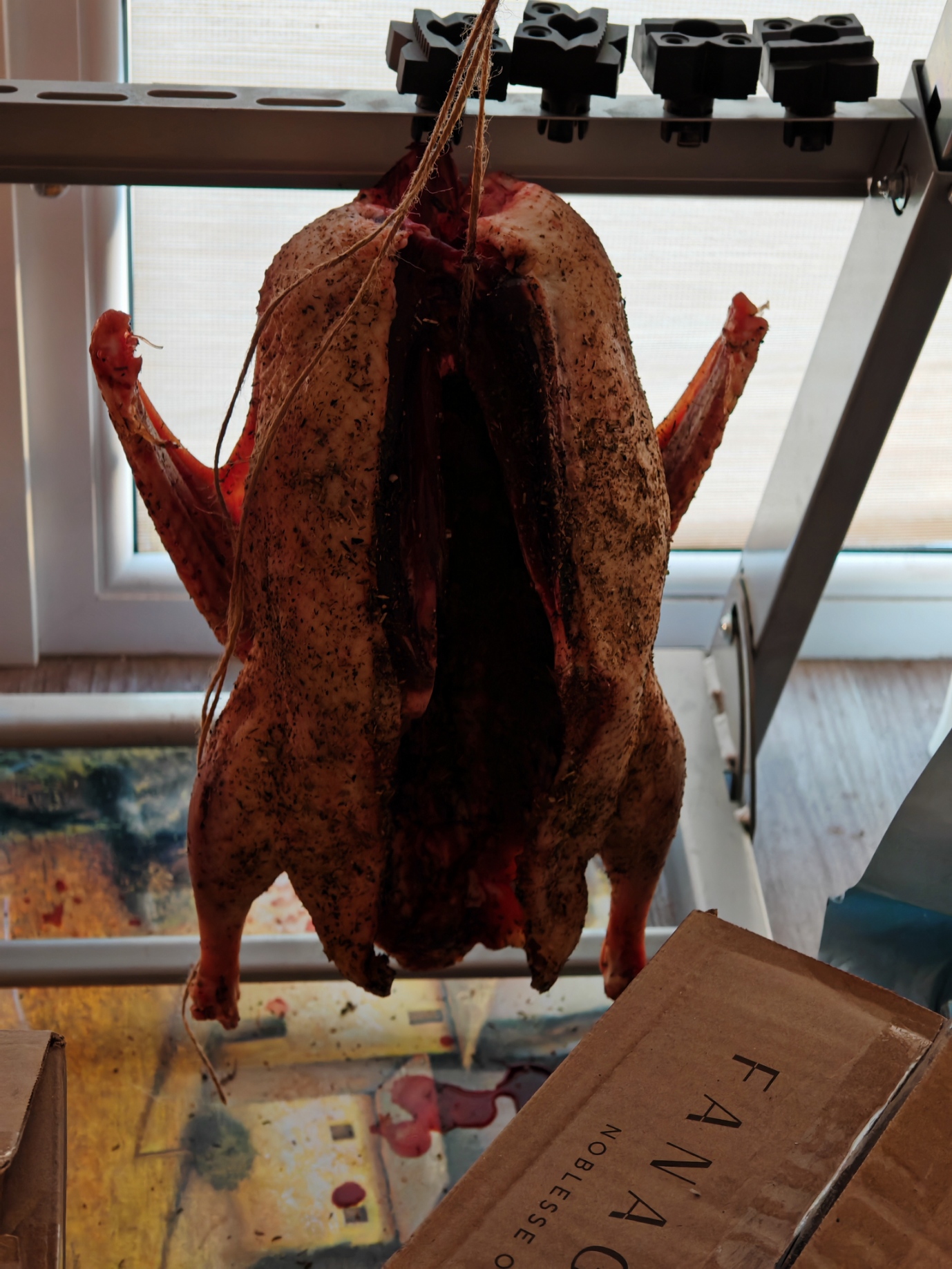 Делаю саламур: вода из расчёта 100 мл на кг утки, соль 18 гр на 100 мл воды, несколько горошин чёрного перца, душистого перца, пару лавров, головка чеснока, разрезанная пополам и 2 чайные ложки Хойсина. Все это кипятится минут 10, а потом остужается и настраивается в холодильнике. После этого рассол фильтруется и им шприцуется утка из расчёта 100 мл рассола на 1 кг утки. Утка маринуется сутки. Потом слегка обмазываю утку соусом Хойсин, в фольгу и в духовку на 170-180 градусов часа на 2. Я довожу утку до 68-69 градусов внутри грудки. Потом Фольга снимается и под верхний гриль для хрустящей корочки. В итоге получается неплохой закос под Пекиндак