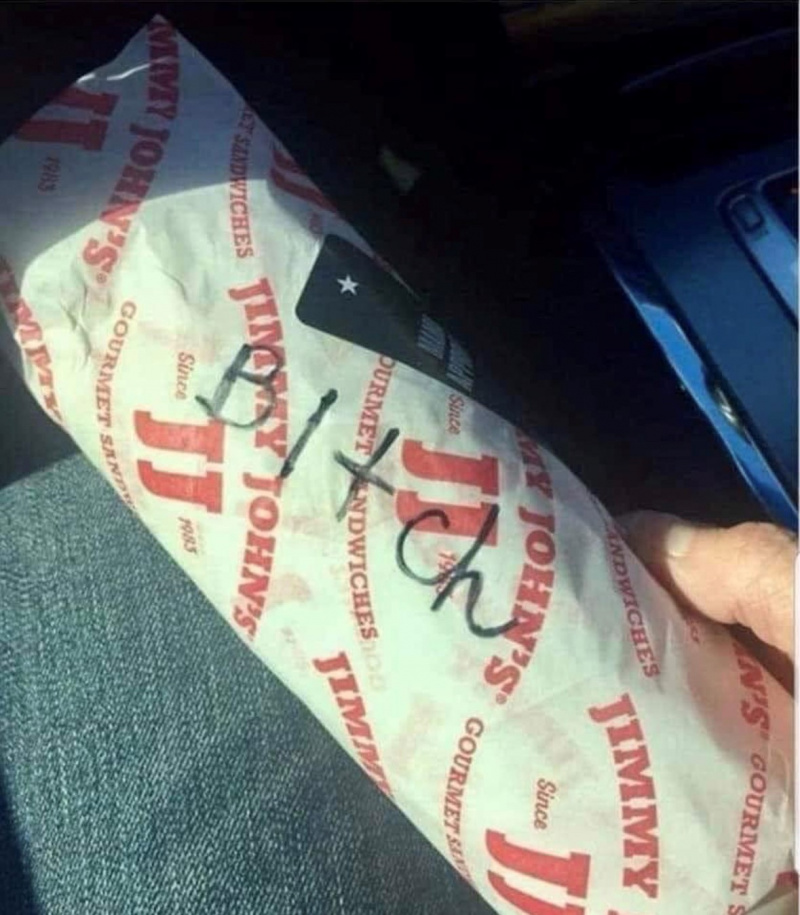 Всего лишь пересказ анекдота, размещенный для сбора лайков и привлечения внимания к ФБ-странице заведения общепита. Ни мужа, ни жены не существовало, а надпись Bltch на упаковке автор анекдота, скорее всего, сделал сам. Смотрим на того, кто это запостил, и делаем выводы: