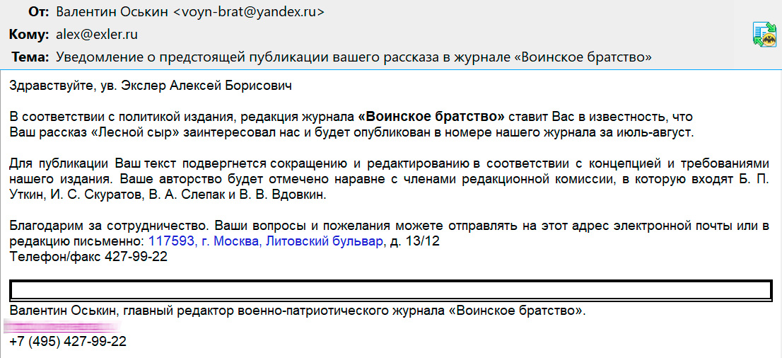 Поскольку это слишком странно даже для воинского братства и поскольку такие письма пришли как минимум еще нескольким писателям (в частности, Лене Каганову точно пришло), я думаю, что это просто типа такая раскрутка - мол, писатели возмутятся и напишут, а им рекламка.