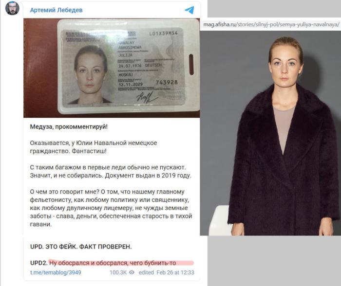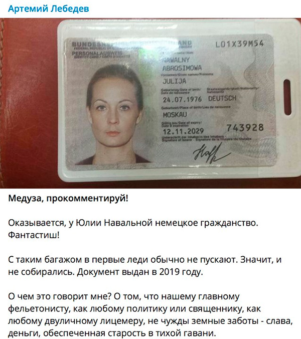 Странно, что нигде не появилось комментария, что "не всё так однозначно". Понятно же что для прикрытия жену никому неизвестного и ненужного блоггера сотрудники BND лично фотографировали на гражданство Германии прямо во время фотосессии для "Афиши". Всё же очевидно!