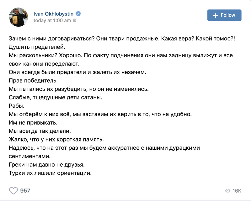 Мы (православнутые) - раскольники, мы будем душить предателей, отберем у них все, потому что победитель прав и нам вылижут зад. Мы всегда так делали.