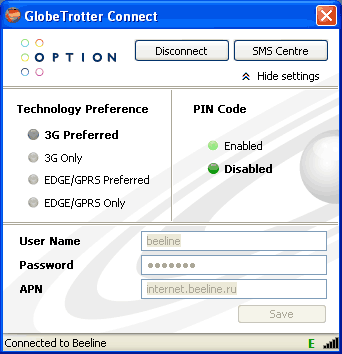 После этого остается только перезагрузить машину. После загрузки в системной области уведомлений появится значок, при щелчке по которому возникает окно специальной программы соединения с Интернетом. Все настройки там были прописаны автоматически - осталось только нажать кнопку Connect.