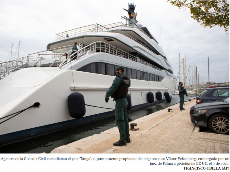 В тот же день другой судья, в данном случае с Майорки, также арестовал по запросу США «Танго», 78-метровое судно стоимостью 90 миллионов евро, плавающее под флагом Островов Кука, где оно фигурирует в названии компании, базирующейся на Британских Виргинских островах, которой, в свою очередь, управляют компании в Панаме. Его предполагаемый реальный владелец — Виктор Вексельберг , владелец группы «Ренова» (бизнес-конгломерат с интересами в алюминиевом, энергетическом и телекоммуникационном секторах), состояние которого журнал Forbes оценивает более чем в 13 миллиардов долларов.