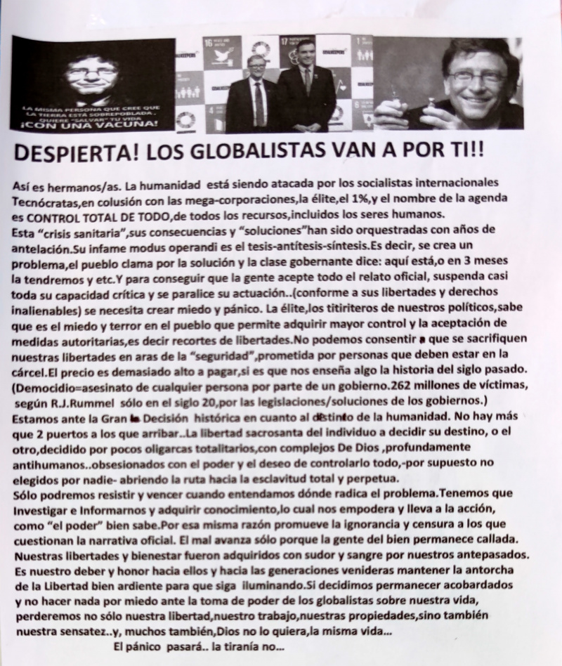 (удовлетворенно) Не только в России есть никиты-мудозвоны, в Испании они также имеются. Листовки расклеивают вот такие. Мировой заговор глобалистов, всех нас хотят поработить, мы должны биться за свою свободу и вся такая бажа. На стене вокзала сегодня сфотографировал на прогулке.