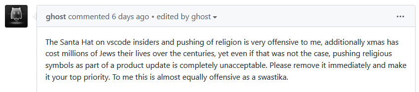 Вообще было бы логично, чтобы идиот сразу же оскорбился и на снежинку, потому что от холодов погибли миллионы евреев, и эта снежинка для него также оскорбительна, как и свастика, но тут уже другие пользователи стали интересоваться у Microsoft, почему они немедленно прогнулись под этого идиота, хотя прекрасно понятно, что колпак Санты - это не религиозный символ, а уж сравнивать его со свастикой - так этому парню надо бы в башке поискать, сохранились ли там хоть какие-то извилины.